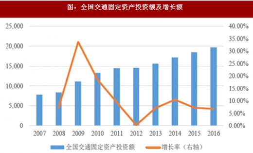 交通固定资产总投资额决定着相应业务的市场规模。2017 年,中国经济仍处于结构转型升级与“去产能、去库存、去杠杆、降成本补短板”的改革深化、红利释放的等待期。必须加大固定资产投资、尽早实现服务业的转型升级,以进一步拉动中国经济增长。交通运输业作为基础设施建设业的重要抓手,促进交通运输业提质降本增效,是深化供给侧结构性改革的有效途径和重要内容。