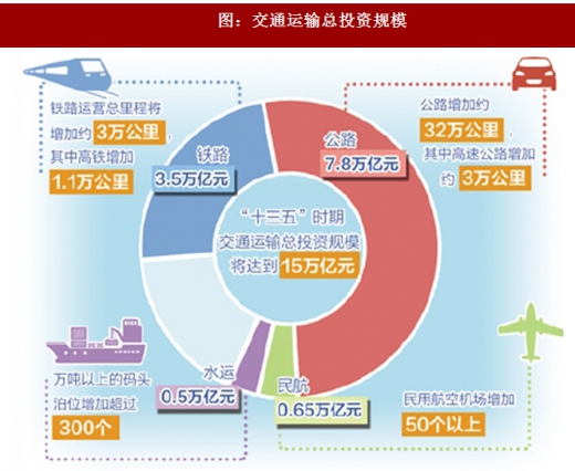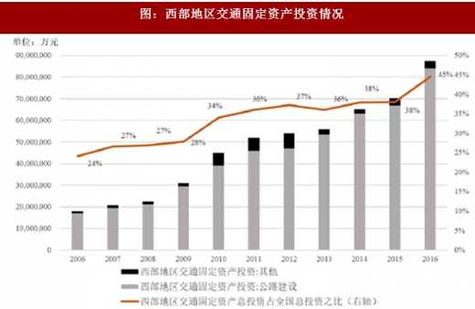 历经多年的建设热潮和经济稳步增长,全国交通固定资产投资额随着GDP的增长呈现缓步增加态势。“十二五”时期各种运输方式基础设施都具备了相当规模和水平,正进入衔接成网的阶段。“十三五”仍然是交通运输基础设施集中建设、扩大规模的重要时期,也是优化结构的关键节点。其中,由于西部地区在基础设施建设方面落后于全国平均水平,其未来将是我国基础设施建设的重点区域。