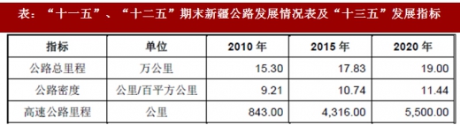 截至2015 年末,全疆公路线路年末里程17.83 万公里,较2010 年末的15.30万公里增加2.53 万公里,年复合增长率达到3.11%。与此同时,新疆高速公路里程有显著提高,截至2015 年末,全疆高速公路里程达到4,316 公里,较2010年末的843 公里增长411.98%,年复合增长率高达38.63%。除和田外所有地州市政府所在地及兵团师部驻地均实现高速公路覆盖。普通公路技术状况显著改善,自治区县城、兵团团场通二级公路比例由“十一五”末的45%和20%增加到92%和82%。