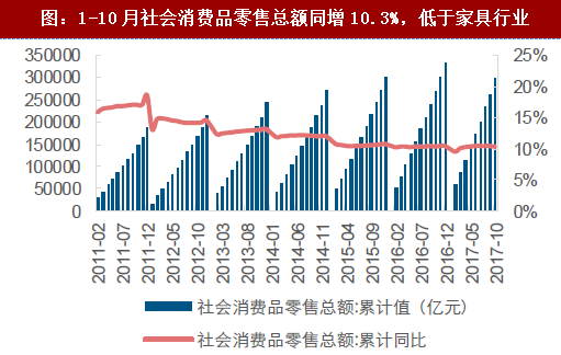 图:1-10月社会消费品零售总额同增10.3%,低于家具行业