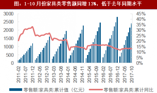 图:1-10月份家具类零售额同增13%,低于去年同期水平