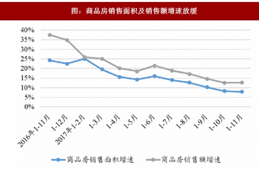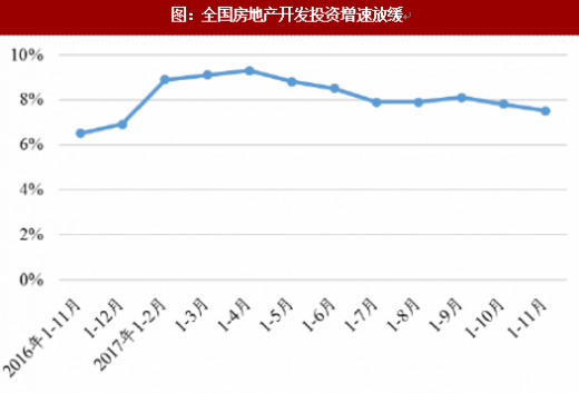 地产调控逐渐显现影响,商品房销售面积及销售额增速放缓。2017年1一11月,全国房地产开发投资100387亿元,同比名义增长7.5%,其中住宅投资68670亿元,增长9.7%,增速回落0.2pct.o1一11月份,商品房销售面积146568万平方米,同比增长7.9%,增速比1-10月份回落0.3pct.,其中住宅销售面积增长5.4%。商品房销售额115481亿元,增长12.7%,增速提高O.lpct.,其中住宅销售额增长9.9%,房地产投资开发增速、商品房销售面积及销售额增速放缓。