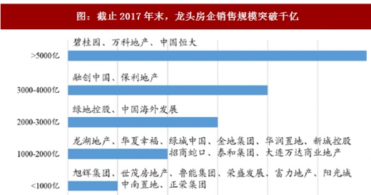 行业整体增速放缓背景下,地产龙头业绩保持快速增长。截至2017年末,碧桂园、万科、恒大全年销售规模突破5000亿元,保利、融创两家已突破3000亿元。未来2~3年内千亿房企阵营的竞争激烈程度将加剧,市场份额争夺即将进入白热化。
