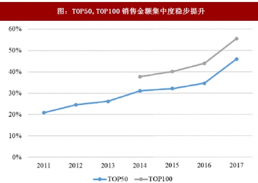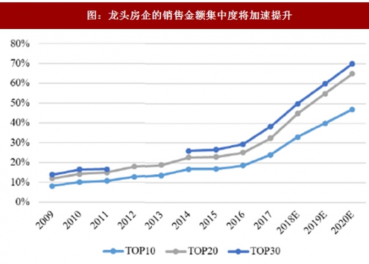 从销售金额来看,龙头房地产企业的集中度将加速提升。2009年TOP10,TOP20,TOP30的销售金额集中度分另,{为8.16%,11.89%,13.82%,到2017年,上述三个梯队的集中度分别提升至18.7%,25.2%和29.4%。TOP10集中度提升的幅度高于TOP10}20和TOP20~30,市场份额加速向龙头靠拢,预计未来有望延续这一趋势。而中小型房地产企业规模提升的速度相对平稳,2011-2017年TOP30~50的集中度从4.22%提升至7.5%>TOP50}100的市场份额从6.63%提升至9.6%。