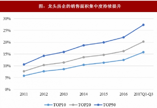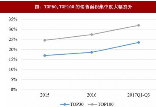 销售面积的集中度低于销售金额的集中度,但提升趋势同样明显。TOP10,TOP20,TOP50的集中度分别从2011年的5.78%/7.66%/10.57%提升至2016年的12.5%/16.20%/22.10%,其中TOP10在2017年Q1~Q3的集中度达到了15.8%。由于龙头房企的楼盘价格相对较高,因此销售金额的集中度高于销售面积的集中度。随着市场调控压力的持续和规模房企竞争优势的体现,未来TOP100房企的整体业绩规模将继续增长,销售面积的集中度将进一步上升。