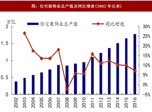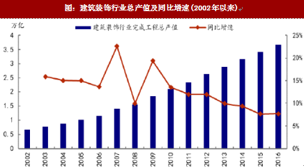 建筑装饰行业作为建筑工程行业的重要组成部分,通过运用装饰材料对建、构筑物内外部进行装饰装修,提升其使用功能和艺术价值,具有丰富的技术含量和艺术内涵。改革开放以来,我国建筑装饰行业逐步发展成为一个专业化工程领域,行业年总产值由1978年的150亿元增长到了2016年的3.66万亿元,产值提高近250倍。