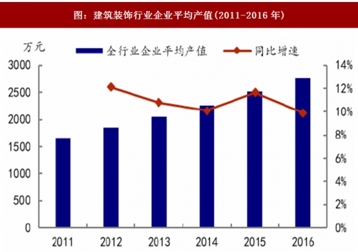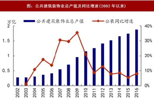 2016年,全国建筑装修装饰行业完成工程总产值3.66万亿元,同比增长7.6%,高于我国GDP增速0.9个百分点。其中公共建筑装修装饰全年完成工程总产值1.88万亿元,比2015年增加1400亿元,增长幅度为8.05%;住宅装修装饰全年完成工程总产值1.78万亿元,相比2015年增加1200亿元,增幅7.2%。
