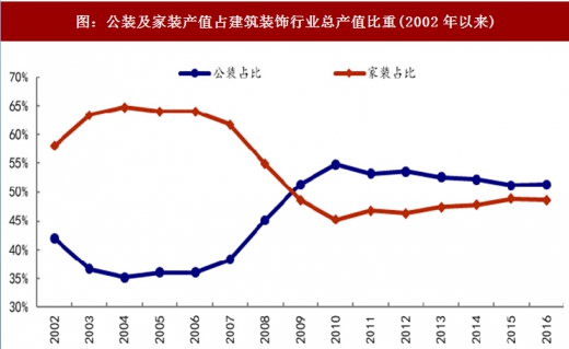 从2002年以来建筑装饰行业产值结构发生了较为明显的变化:2002-2006年,家装产值相对于公装具有较为明显的优势,尤其是在2004-2006年,家装已占据建筑装饰市场64%以上的市场份额,这与房地产市场升温及居民消费升级具有很大关联性;2007-2010年,公共建筑装饰的产值所占比重明显提升,2010年其所占比重已超过家装产值达到54.76%,产生这一变化的主要原因在于全球金融危机带来的国内房地产市场的姜缩,以及由于一系列经济刺激政策带动的基建投资,推动了公装市场的快速发展;2010年至今,公装与家装均步入平稳发展阶段,两者产值占比维持在相对稳定的水平。