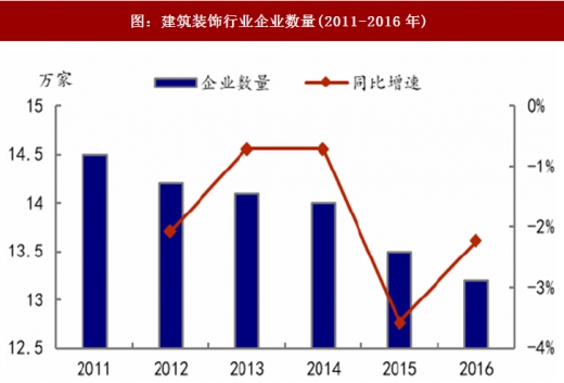 目前装饰市场趋于成熟、产品服务同质化严重,导致现有建筑装饰企业竞争较为激烈。根据中国建筑装饰行业协会数据,2011-2016年,全行业企业总数大约由14.5万家减少至13.2万家,年均降幅达1.9%,退出市场的主要是在库存严重、去库存前景不佳的三、四线城市以散户住宅装修装饰的小微企业,有资质的并已换新资质证书的企业退出市场的极少。