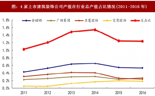 由于建筑装饰行业市场规模大,进入门槛相对较低,因此市场集中度依然较低。以行业4家上市龙头公司金睦螂、广田集团、亚夏股份及宝鹰股份为例,2016年这4家上市公司全年总产值占全行业的1.24%,其中营收规模最大的金睦螂占比也不过0.54%。同时2011-2016年,4家上市公司总营收占比经历了先上升后下降的过程,行业集中度低,大行业、小公司的格局仍旧是行业现状。