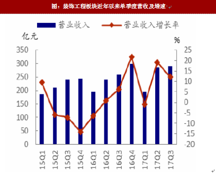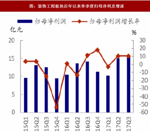 装饰工程为地产后周期,虽然今年一二线城市楼市受到调控影响,但三四线地产销量向好叠加二手房再装修的需求,板块业绩增速保持平稳。