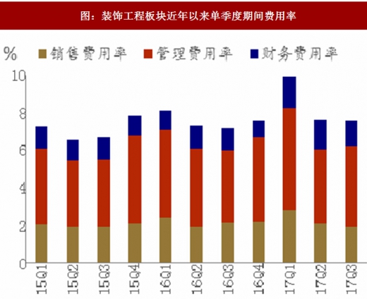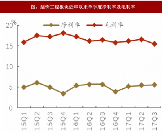 17Q1/Q2/Q3装饰工程板块净利率分别为5.16%/5.49%/5.57%,较去年同期下降0.22/0.23/0.15个百分点。17Q1/Q2/Q3毛利率分别为16.2%/16.61%/15.5%,较去年同期下降1.08/上升0.45/下降0.99个百分点。