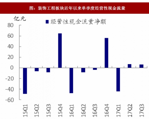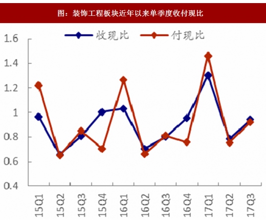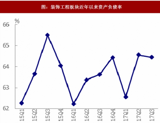 装饰工程板块经营性现金流量的变化反映了其季节性特征,今年Q1经营性现金流净流出相对去年同期减少,Q2及Q3经营性现金流量回正,说明板块现金流状况向好。板块17Q3资产负债率为64.45%,比去年同期的63.63%增长0.82个百分点。