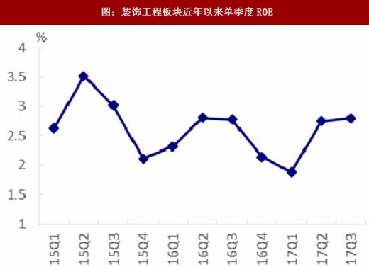 收付现比方面,装饰工程板块收付现比双双上升,其中收现比上升0.14个百分点,付现比上升0.11个百分点,收现比的上升幅度大于付现比,反映现金流状况有所改善。17年板块01/02/03的ROE分别为1.88%/2.75%/2.8%,呈上升趋势,主要是由于板块内公司利润规模增长所致。