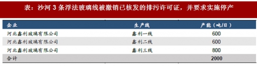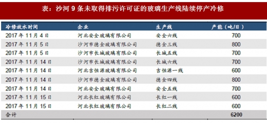 10 月31 日,邢台市环保局发出《关于对未持有国家统一制式排污许可证玻璃企业实施停产的函》,对未取得排污许可证的生产线实行停产。11 月5 日到15日,沙河地区9 条玻璃生产线因未取得排污许可证陆续放水停产,日熔量6200T/D,约占全国在产产能4%,为玻璃行业近年来首次实质性关停产线。