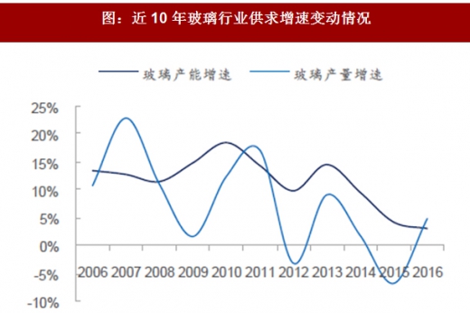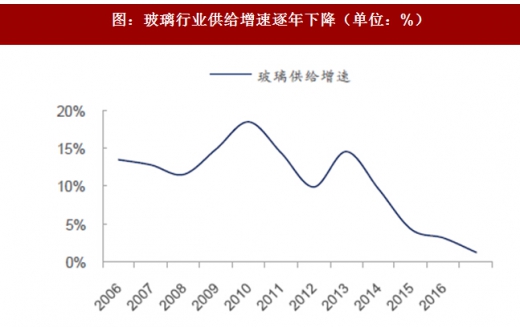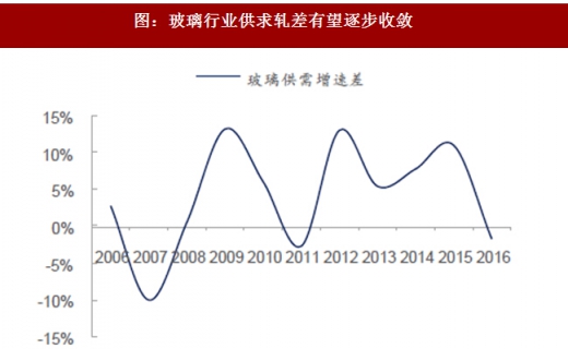 玻璃行业有些分析部分与水泥行业类似,浮法玻璃产能扩张也逐步趋于平稳,行业供给增速自2014 年以来快速下滑,并于2016 年达到历史低点至3.16%,预计增速有望继续下行。中长期来看,供给需求增速总体变动将趋于平稳,供给向下概率大,供求轧差也有望逐步收敛。