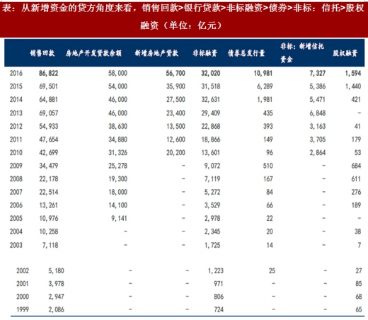从新增资金的贷方角度来看,销售回款>银行贷款>非标融资>债券>股权融资。据我们估算,2016 年销售回款8.7 万亿,新增房地产开发贷5.7 万亿,非标融资3.2 万亿(新增信托融资七千余亿元),信用债发行1.7 万亿,股权融资1594 亿元。