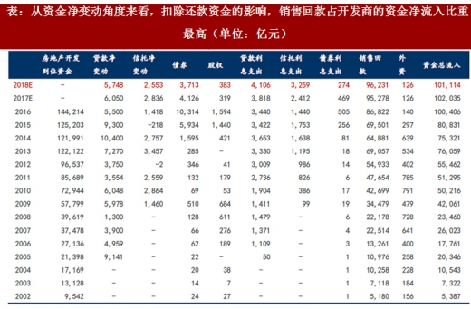 我们预计2018 年行业整体融资环境依然较严,银行贷款净变动降幅5%,信托、债券净变动-10%,销售回款增速1%(主要系我们预测2018 年销售面积增速0%),资金总流入预计为10.1 万亿,略低于2017 年资金流入。
