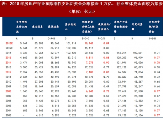 我们预计2017 年开发商最低现金流出8.7 万亿,资金总流入10.3 万亿,刚性资金余缺1.6 万亿,资金压力较低,房价下行风险较小。我们预计2018 年开发商最低现流出9.0 万亿,资金总流入10.1 万亿,刚性资金余缺1.1 万亿,接近历史上1 万亿临界值,资金压力将明显较2017 年紧张。