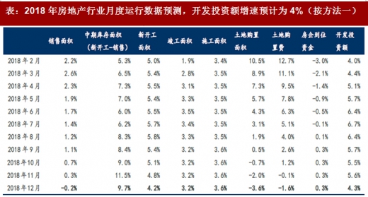 我们认为2018 年房地产开发投资增速较高且主要由新开工和施工的建安成本上升所带动。我们预测1)低库存下开发商推盘量增加,去化率低速下降,新开工增速高于销售增速导致短期库存回升,进而土地购置面积负增长(且预计房企融资环境整体依然较紧);2)销售均价稳定,但同等价位可以购买到更优质的楼盘,因此推盘量增加可部分抵消去化率下降的影响带动销量回升,预计前50%的房企2018 年销售增速在20%-30%,推盘量增速大约在30%-40%。