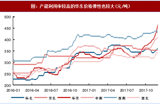 图:产能利用率较高的华东价格弹性也较大(元/吨)