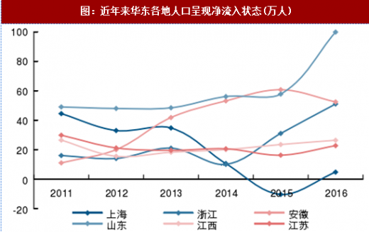 图:近年来华东各地人口呈现净流入状态(万人)