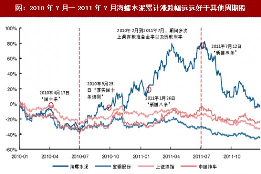 图:2010年7月一2011年7月海螺水泥累计涨跌幅远远好于其他周期股