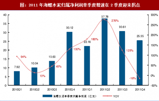 图:2011年海螺水泥归属净利润单季度增速在2季度迎来拐点