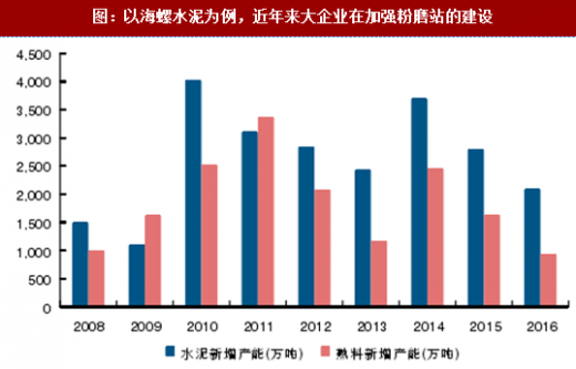 图:以海螺水泥为例,近年来大企业在加强粉磨站的建设