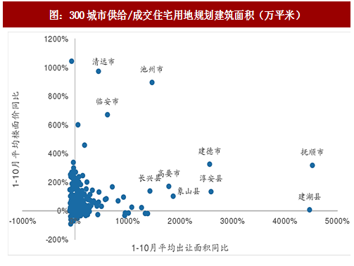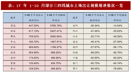 同样,从量价角度来看,17年1-10月,三线城市中,位于长三角的临安、常熟、安庆、舟山以及位于珠三角周边的清远、肇庆、中山等卫星城卫星城市宅地供应量价齐涨。而位于湖北省内的仙桃、十堰、荆门等部分中部地区城市出现了宅地成交量价齐跌的现象。