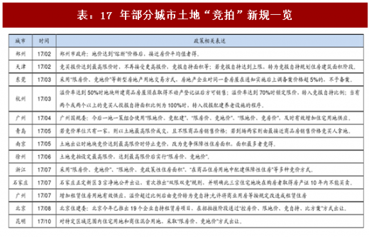 此外,地方政府加强对土地出让金资金来源的审核,例如17年2月上海土拍市场因资金来源问题现场取消两房企竞拍资格,而部分城市对土地首付款的比例(一般不低于50%)及余款支付时间提出具体要求,以加强防范银行理财资金借到非标进入土地市场。在后端的预售方面,近60个地方政府对备案价格以及上涨幅度提出限制,对平抑房价上涨过快起到积极作用。