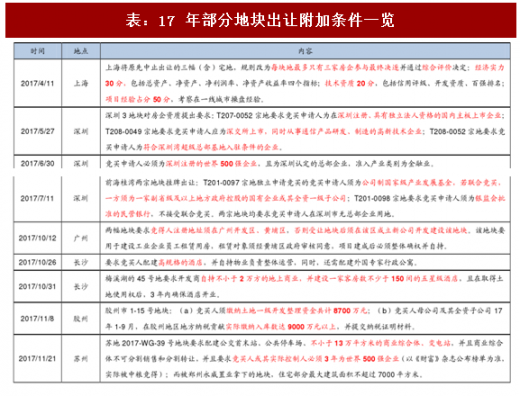 值得一提的是,17年下半年部分城市地块对房企资质进行了限制,例如深圳 A002-0060宗地要求竞买电请人必须为深圳注册的世界500强企业,而前海两宗地块对于主体资格规定更为严格,其中一宗地要求竞买人为公司制国家级产业发展基金,另一宗地要求竞买人为银监会批准的民营银行,土地出让接近定向转让。此外,在 17年11月,苏州2017-WG-39号地块要求配建商业综合体,并且要求拿地房企为连续3年世界500强企业。地方政府提高拿地门槛,会促使龙头房企集中度的进一步提升,同时中小房企拿地相对更加困难。
