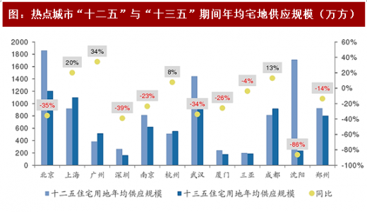 从长期来看,地方政府在中央部署后,先后出台了宅地供应“三年滚动计划” 以及“五年计划”,落实到年均供应规模数据,若考虑北京集体用地转化部分以及深圳提升供地容积率,整体而言,一线城市“十三五”期间宅地供应规模相比于“十二五”有所提升。而我们统计的二线样本城市中,仅有杭州、成都宅地供应规模有小幅提升,其他城市供地规模均不及“十二五”期间供应水平。因此,我们需要指出的是,尽管重点城市短期供地有加快迹象,但受制于土地资源“硬约束”的限制,中长期来看,重点一二线城市的住宅用地供给将依旧紧张。