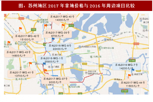 以苏州为例,从16年5月开始,苏州陆续对多个地块限制最高报价,超过最高报价,终止土地出让。比较17苏州拿地项目与16年4月前出让项目,17年拿地均价下滑明显,同时我们发现17年苏州的出让土地在地理位置距离市中心更远。政府在土地出让过程中既要考虑房价上涨的调控目标,同时还要满足自身的利益需求,17年各线城市的供地质量都有所下滑。