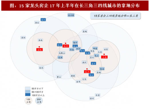 分区域来看,长三角区域内,15家龙头房企17年上半年的布局主要集中在合肥、南京、杭州、上海四城周围。以这四城为中心,多数三四线城市位于其100公里的区域圈内,而少数偏离100公里以外的城市也均位于以上四城200公里范围内。从长三角区域内三四线拿地力度来看,无锡、常州、嘉兴、绍兴、镇江、滁州拿地力度相对较大,而拿地力度较大的城市主要有两类特点,第一,距离中心四城相对较近,例如绍兴、滁州、镇江等地,第二,处于中心四城100公里半径圈交集的城市,例如无锡、嘉兴等地。