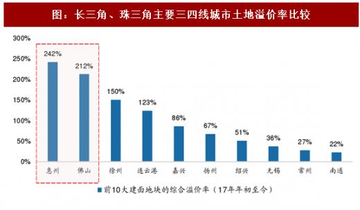 从土地溢价率来看,扣除采用“双限”土拍新规的地块之后,遴选各个城市17 年年初至今拿地建面前10大的地块项目计算溢价率,珠三角城市溢价率显著偏高,例如惠州17年以来建面前10大地块综合溢价率已高达242%,佛山达到212%,而长三角区域内房企拿地力度较大的无锡、常州、绍兴仅为36%、27%、51%,溢价率相对偏高的徐州、连云港、嘉兴前十大建面地块的综合溢价率达150%、123%、86%,与珠三角城市相比仍然有所偏低。