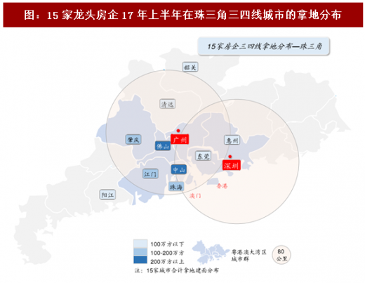 而相比长三角新增土储的三四线城市分布,龙头房企在珠三角城市群的三四线城市布局更为集中,从15家龙头房企的拿地分布来看,以佛山、重视、珠海、肇庆、江门、东莞、惠州等地为主,基本分布在以广州、深圳为核心的80公里半径圈以内。同时,除韶关、清远、阳江之外,其余城市均属于粤港澳大湾区城市群。珠三角三四线拿地城市的集中化意味着其土地市场竞争相比长三角三四线城市更为激烈。