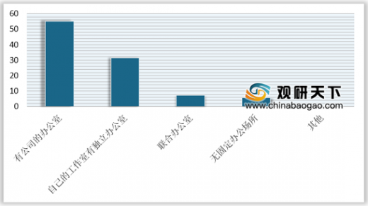 工作环境的调查上,过半设计师有固定的办公空间,比例为55.15%;有自己的工作室的设计师比例达31.46%,而7.38%的设计师有联合办公空间,还有5.83%的设计师没有固定的办公场所,0.19%的设计师有其他情况。