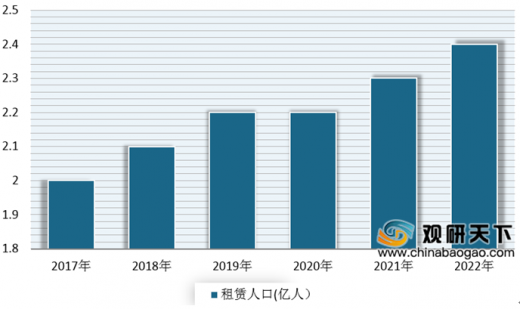 因此在此背景下,我国的长租公寓得到了有效的扩展。根据数据显示,截止到2018年,我国房屋租赁市场租赁面积达到67.3亿平方米,预计2022年将达到80.6亿平方米;房屋 租赁 市场租赁人口达2.1亿人,预计2022年将达到2.4亿人。