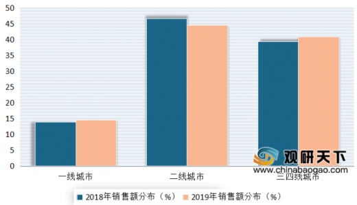 从各等级城市来看,百强企业的销售来源主要来自二线城市。以50 家百强代表企业为例,数据显示,2019年,我国50 家百强代表企业重点项目销售在一线城市销售额占比为 14.6%,二线城市占比为 44.5%,三四线城市占比为40.9 %。
