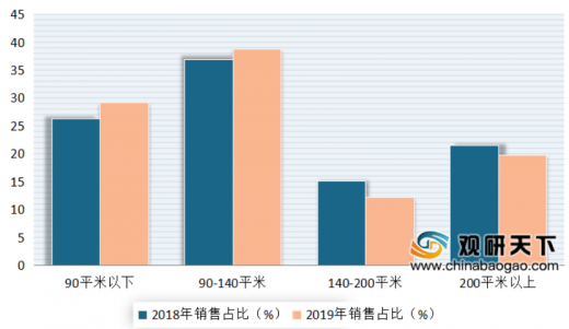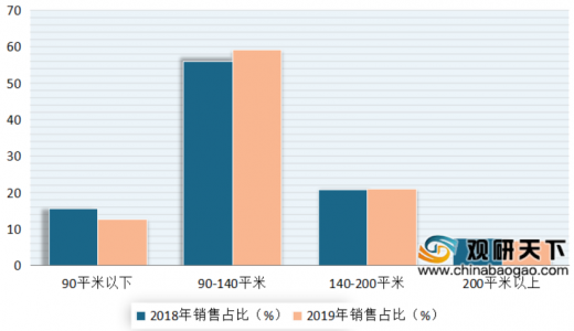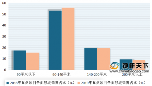 从各面积段销售占比来看,90-140 平米首改类产品占比最大,达到了 56.1%,较上年提升 2.8 个百分点;其次为90 平米以下首置类、200 平米以上高端类及 140-200 平米改善类产品,其销售额贡献率分别为 15.5% 、8.8% 、19.6%,均较上年有所下降。