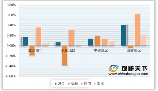 分区域来看,2020年第一季度,在全国重点城市中,东部、中部、西部地区综合地价环比增速依次为0.07%、0.14%、0.41%,较上一季度分别下降0.16、0.38、0.32个百分点。