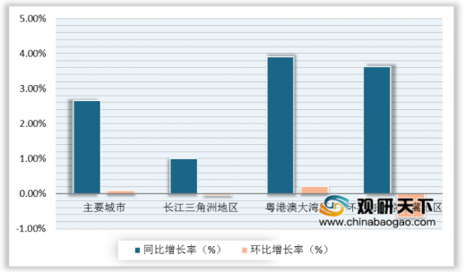 从我国三大重点区域来看,2020年第一季度,我国三大重点区域综合地价环比增速持续下降,长江三角洲地区、粤港澳大湾区、环渤海与京津冀地区综合地价增速依次为-0.05%、0.20%、-0.68%,较上一季度分别下降0.14、0.42、1.29个百分点;从同比增速看,长江三角洲地区、粤港澳大湾区、环渤海与京津冀地区综合地价同比增速依次为1.0%、3.89%、3.63%,较上一季度分别下降0.70、1.67、1.75个百分点。