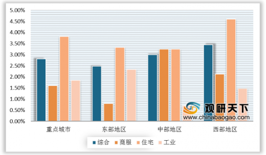 从同比来看,我国东部、中部、西部地区各用途地价增速均回落。其中东部地区综合、商服、住宅、工业地价同比增速依次为2.48%、0.80%、3.32%、2.33%,较上一季度分别下降1.19、1.44、0.84、1.34个百分点;中部地区综合、商服、住宅、工业地价同比增速依次为3.0%、3.25%、4.06%、0.71%,较上一季度分别下降1.16、1.15、1.56、0.25个百分点。