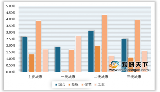三线城市,2020年一季度,我国综合、商服、住宅、工业地价环比增速依次为0.01%、-0.24%、0.31%、-0.19%,较上一季度分别下降0.66、0.81、0.70、0.53个百分点;同比增速依次为2.51%、1.11%、3.98%、1.62%,较上一季度分别下降1.10、1.33、1.07、0.89个百分点。