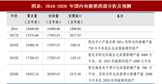 2011 年至 2016 年,国内电极箔需求量年化增长率高达 8%,我们认为铝电解电容下游需求增长稳定,保守预计未来三年需求增速有望保持在 6%,同时我们预计此次环保关停至少导致中小厂商 20%产能关停,根据上市企业产能计划我们预计从2018 年起电极箔有望迎来供需紧平衡,甚至会出现偶发性的供需缺口。