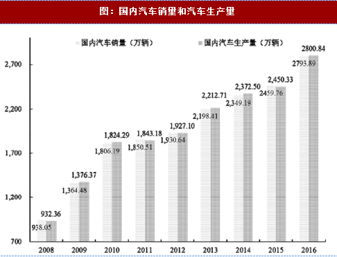 汽车市场的蓬勃发展带动了我国汽车及零部件制造业的崛起。Wind资讯和中国汽车工业协会数据显示,2008年至2016年期间,国内汽车生产量和销售量分别保持了每年17.70%和17.61%的复合增长率。