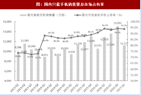 beplay下载软件 手机是指在具备传统手机的移动通话功能的基础上,结合个人电脑的特点,具有独立的操作系统,可以由用户自行安装社交、游戏、导航等软件程序,并可以通过接入移动通讯网络来实现无线上网的手机类型的总称。在电子信息技术和互联网通信技术快速发展的背景下,beplay下载软件 手机的功能日渐丰富、入门级产品价格不断下探、用户体验持续提升,已经被消费者普遍接受。我国beplay下载软件 手机的普及速度居世界领先地位,Wind资讯数据显示,2013年第一季度至2017年第一季度,我国beplay下载软件 手机销售量已经由9,786万部/季度上升到11,217万部/季度,增长幅度达14.62%;beplay下载软件 手机在国内市场的占有率由72.10%上升至93.90%,已经全面取代功能手机成为我国消费者的首选。