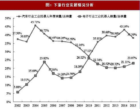 汽车及零部件制造业是自动化生产程度最高的制造产业,对自动化生产设备具有稳定而持续的需求。Wind资讯数据显示,2015年汽车及零部件制造业采购的工业机器人数量占全球工业机器人总销量的38.3%。相比发达国家的汽车制造业,我国汽车整车生产和零部件生产的自动化率仍然偏低,预计未来随着国家产业升级趋势的强化和汽车行业竞争的进一步加剧,我国汽车生产自动化率有望得到提高。在行业固定资产投资和自动化改造的推动下,汽车行业自动化设备的需求将保持较高增长速度。