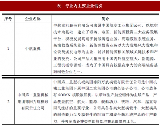 军工锻件产品制造行业内企业主要包括国有大型军工企业或其下属科研院所和民营军品生产企业,国有大型军工企业凭借其技术实力、资金实力、规模优势,成为军工产品的主要生产商,竞争优势显著,而少数具有军品生产资质的民营企业更多集中在产品配套领域。随着国家国有军工企业的改革深化,国家鼓励具有自主研发实力的民营企业逐步参与到高端军工产品的市场竞争中,具有研发实力和资金实力的民营企业有望进一步提高自身的竞争能力。